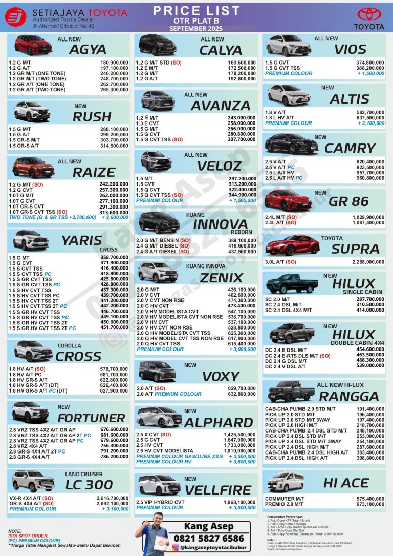 Pricelist Terbaru Mobil Toyota 2025 KETERANGAN:Untuk Unit Spot Order, Indent Time minimal 3 bulan (timing dapat berubah sewaktu-waktu tergantung keadaan Pabrik)Harga OTR DKI Jakarta, Bekasi, Banten per 1 September 2025Untuk informasi harga terkini & promo dapat menghubungi Kang Asep 0821-5827-6586 Dapatkan Penawaran